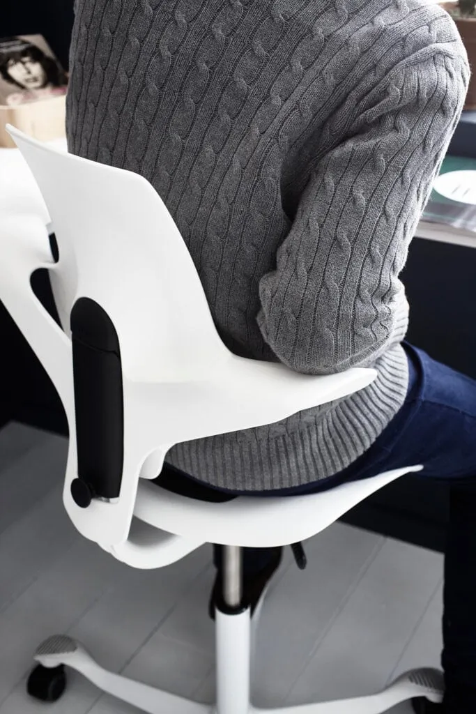 Um langfristige Probleme durch sitzende Tätigkeiten zu vermeiden, reicht es nicht aus, nur den Schreibtisch auf einen höhenverstellbaren Tisch umzustellen. Ein wichtiger Faktor ist auch, welchen Stuhl wir verwenden. Bei der Wahl des richtigen ergonomischen Stuhls geht es nicht unbedingt darum, nach einem Modell mit möglichst vielen Funktionen zu suchen. Funktionen wie eine hohe Rückenlehne oder Armlehnen sind für eine aktive Nutzung oft überflüssig. Stühle mit sogenannten „Komfort“-Designs hindern uns eher an freier Bewegung und verleiten uns dazu, zu lange zu sitzen. Im Gegensatz dazu wurde bei der Entwicklung der HÅG Capisco/Puls Stühle ein entscheidender Aspekt berücksichtigt: Der Stuhl sollte kompakt und so gestaltet sein, dass er den Nutzer zu mehr Aktivität anregt. Besonders die Sattelform der Sitzfläche fördert eine größere Flexibilität beim Sitzen.