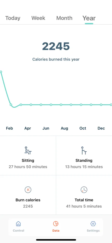 Wenn Sie Ihren höhenverstellbaren BeActive-Schreibtisch immer über die App steuern, werden alle Daten auf Ihrem Smartphone gespeichert. So können Sie leicht nachverfolgen, wie viel Zeit Sie an einem Tag im Stehen verbracht haben, wie viel Prozent Ihres Tagesziels Sie erreicht haben und wie viele Kalorien Sie während der Arbeit verbrannt haben. Diese Statistiken sind täglich, wöchentlich, monatlich und jährlich verfügbar. Sie bieten eine hervorragende Übersicht darüber, wie Sie Ihre stehende Arbeitszeit stetig steigern können.