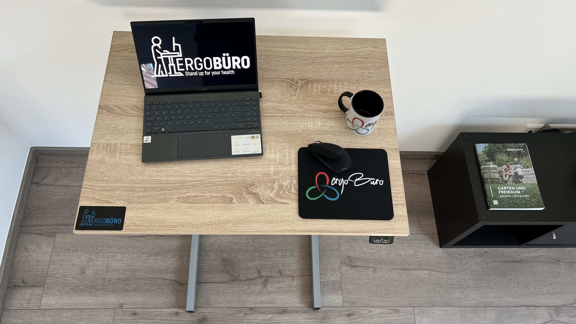 Ein ergonomischer Arbeitsplatz besteht nicht nur aus höhenverstellbaren Tischen – auch das Drumherum zählt. Unser Kunde entschied sich deshalb für weitere praktische Ergänzungen aus unserem Sortiment: