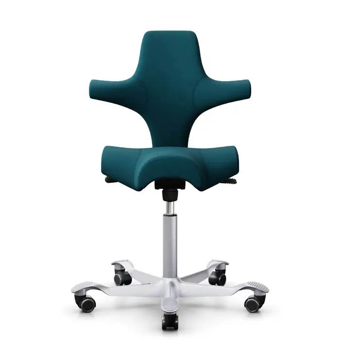 Der HÅG Capisco verfügt über ein Aluminiumfußkreuz, das Sie optional mit gebogenen Fußstützen ausstatten können. Außerdem sind die Stuhlbeine in den Farben Schwarz, Silber oder Weiß erhältlich, und Sie haben die Möglichkeit, ein Fußkreuz aus poliertem Aluminium oder schwarzem Kunststoff zu wählen.