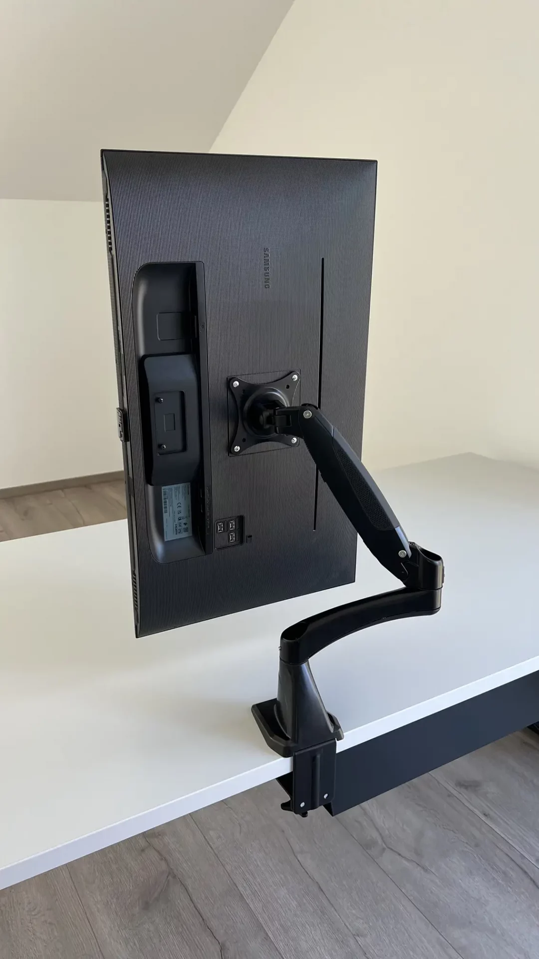 Jeder Monitor, der mit einer VESA-Halterung (100×100 oder 75×75) ausgestattet ist, kann problemlos am Monitorarm befestigt werden. Das VESA-Montagesystem ist eine weit verbreitete Lösung, mit der die meisten Monitore ausgestattet sind. Mit vier Schrauben wird der Monitor entsprechend seines Schwerpunkts am Monitorarm befestigt.